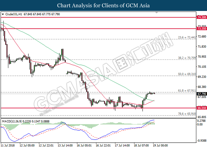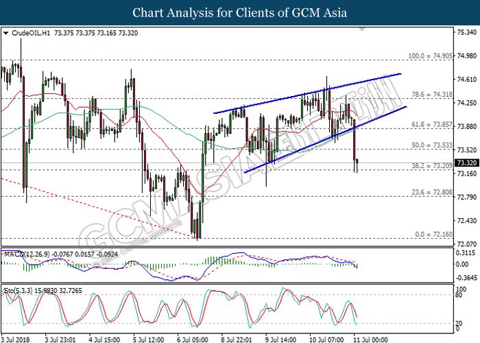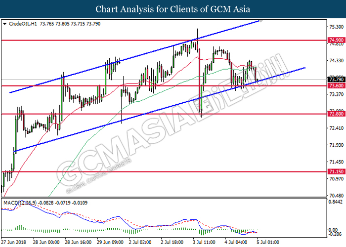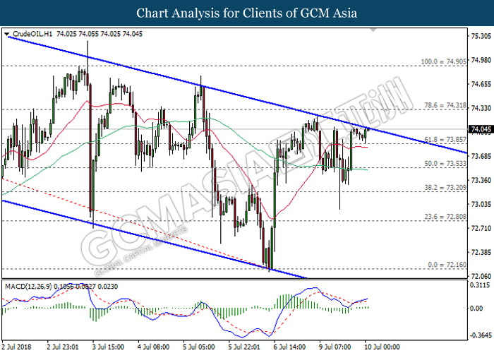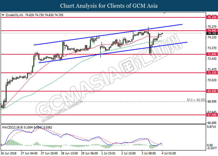 CrudeOIL, H1: Crude oil price was traded higher following prior rebound while recently re-entered into the ascending channel. MACD histogram which illustrate the formation of golden cross suggests further bullish signal. However, a close above 74.90 is required to attain further confirmation.