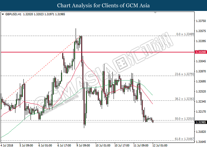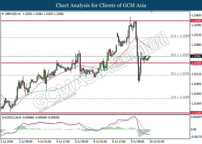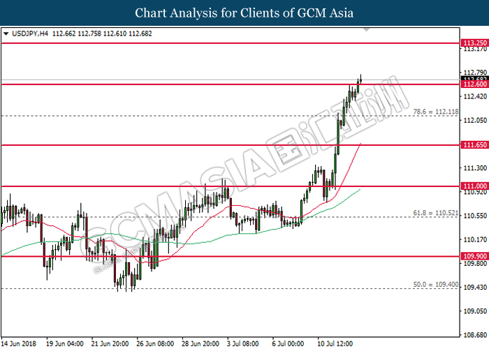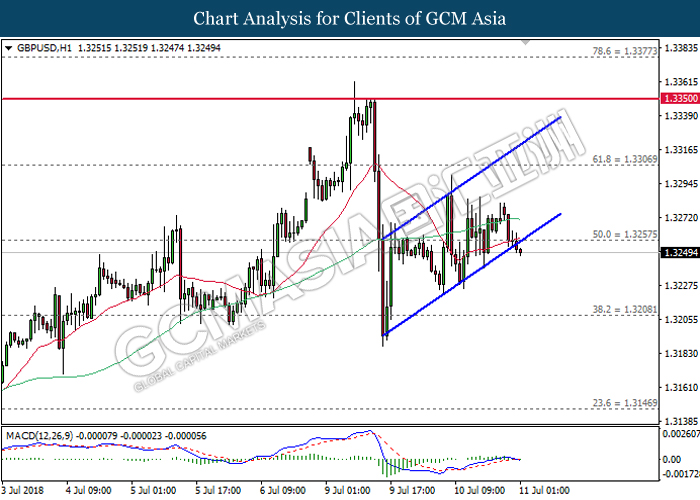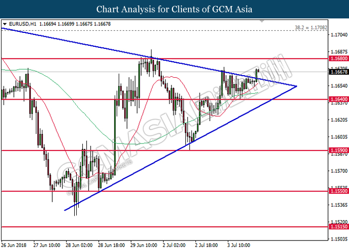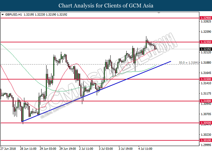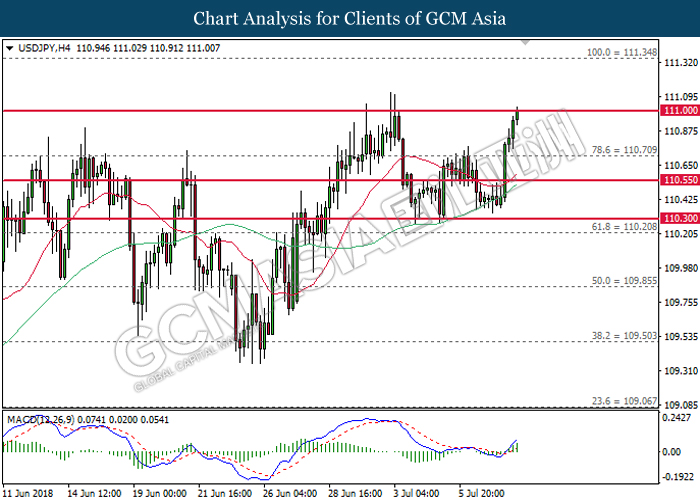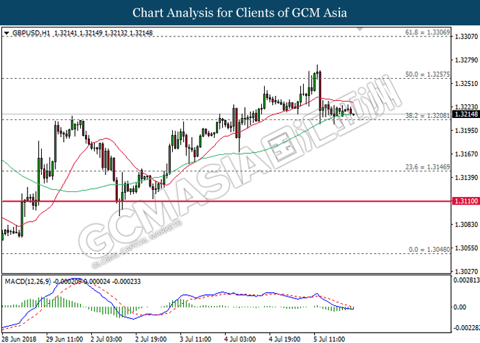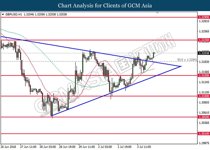 Bears took over greenback’s momentum while US financial market were closed on yesterday following Independence Day celebration. Dollar index slumped 0.15% while last quoted at 94.15 during Asian trading session. With the US market shut, investors will now turn their attention to a rather busy remainder of the week, being FOMC’s meeting minutes and highly anticipated Nonfarm Payrolls report. Likewise, investors were seen to remained cautious ahead of Friday’s deadline whereby US is bound to impose a 25% tariff upon Chinese imports that may see a similar move taken by Beijing as retaliation. On the other hand, pairing of GBP/USD notched up 0.02% to $1.3230 over the backdrop of optimistic economic data. In June, Services PMI shows further expansion with the latest reading at 55.1 versus economist forecast of 53.9. The data portray signs of an economic rebound for the second quarter that may open the door for an August interest rate hike by the Bank of England.