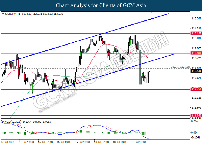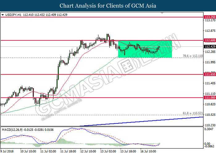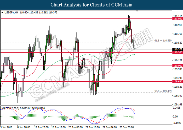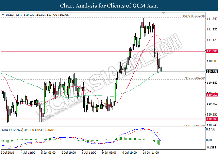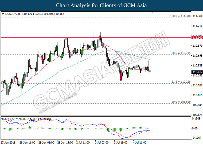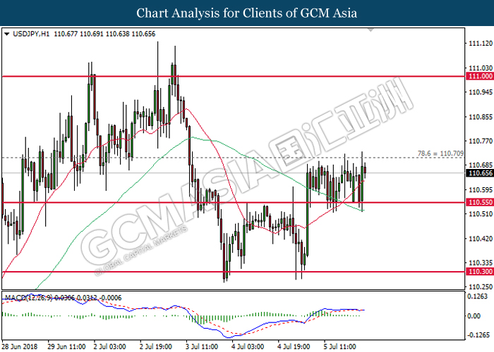 USDJPY, H1: USDJPY remains traded within a tight range that are subjected to 110.55 and 110.75. Due to the lack of signal from MACD and price action, it is suggested to wait for further confirmation before entering the market.
