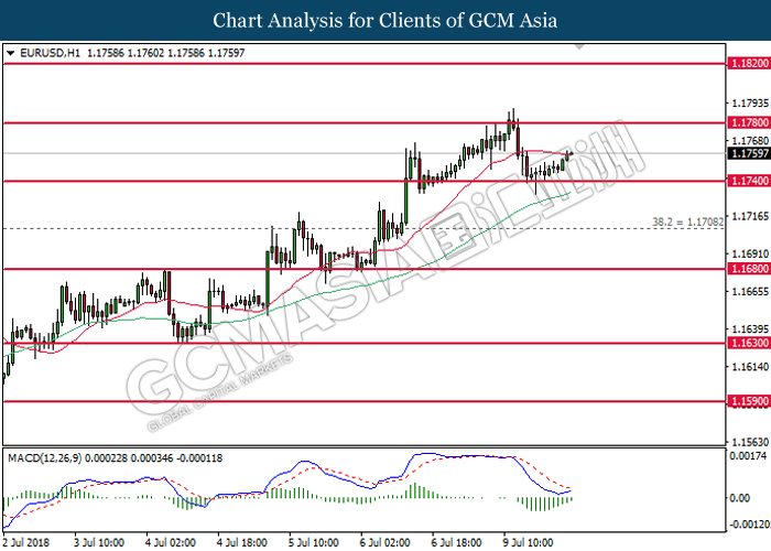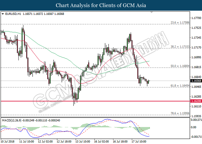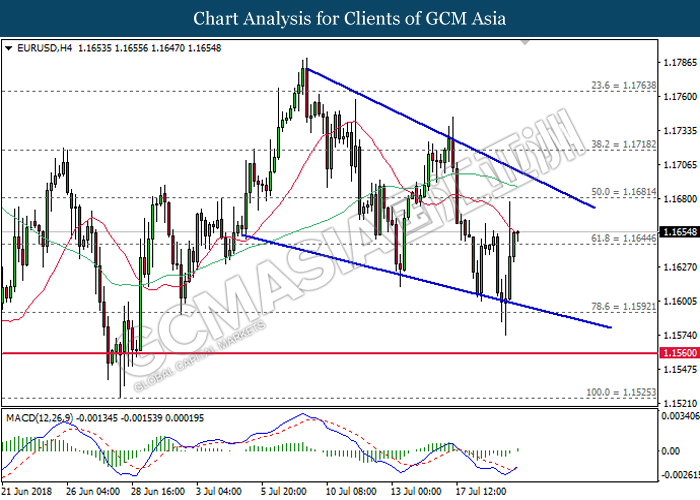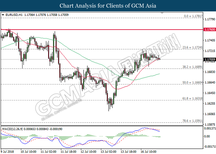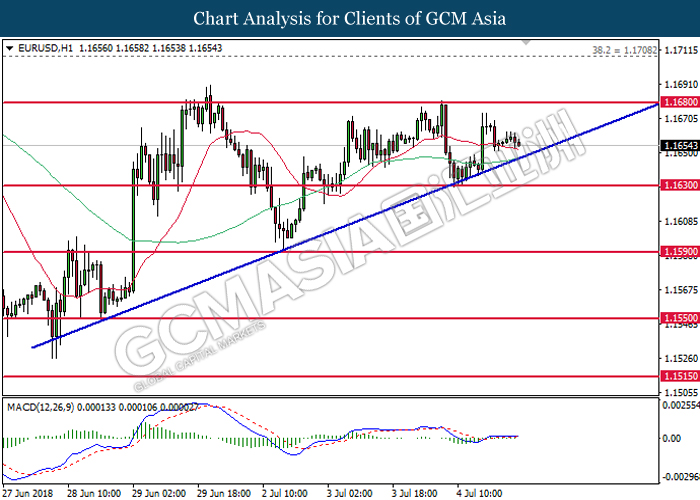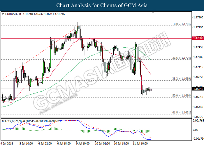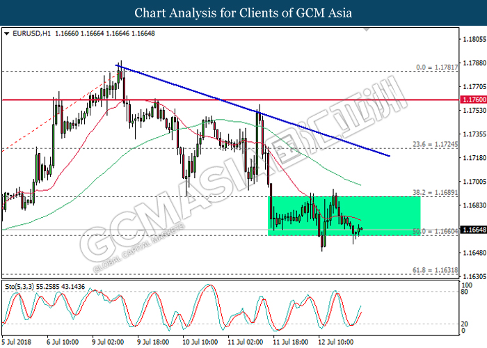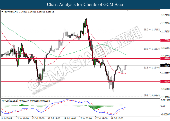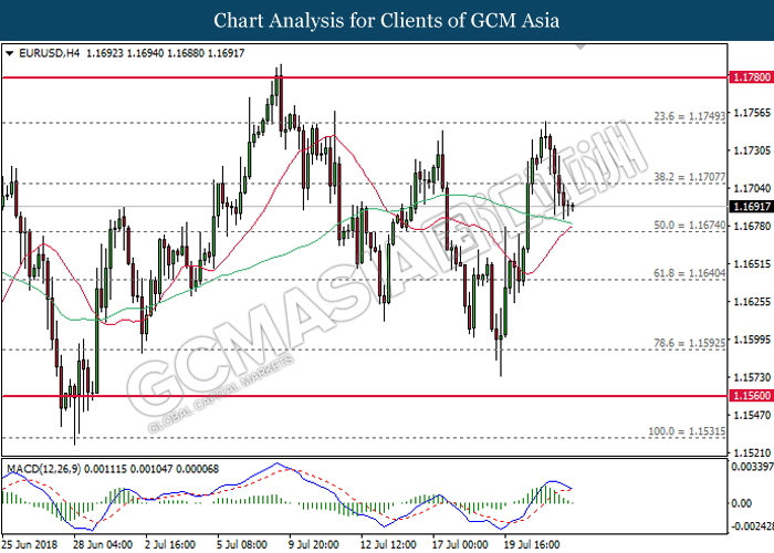 US dollar remained subjected to bearish momentum during North American trading hours while investors digest recent release of FOMC meeting minutes which depicts a rather cautious tone. Majority of the participants noted recent consistency in regional economic growth and deeming it as “very strong” has cemented investors prospect for further rate hike beyond Federal Reserve’s neutral rate target. However, a handful number of the members expressed their concern over recent trade policy tension which had intensified and may lead to a possible slowdown in global economic growth. Higher uncertainty and risks may garner negative effects on regional business sentiment and investment spending. Otherwise, Euro recovered some losses as recent data shows diminishing downside upon Germany’s economic progression. For the month of May, German Factory Orders grew by 2.6% versus economic forecast of 1.1%. The data has reduced the anxiety among investors following prior series of data which signals possible economic slowdown. As of writing, dollar index was down 0.11% to 94.07 while pair of EUR/USD notched up 0.02% to $1.1692.