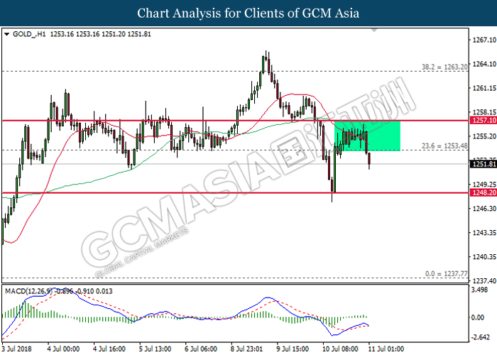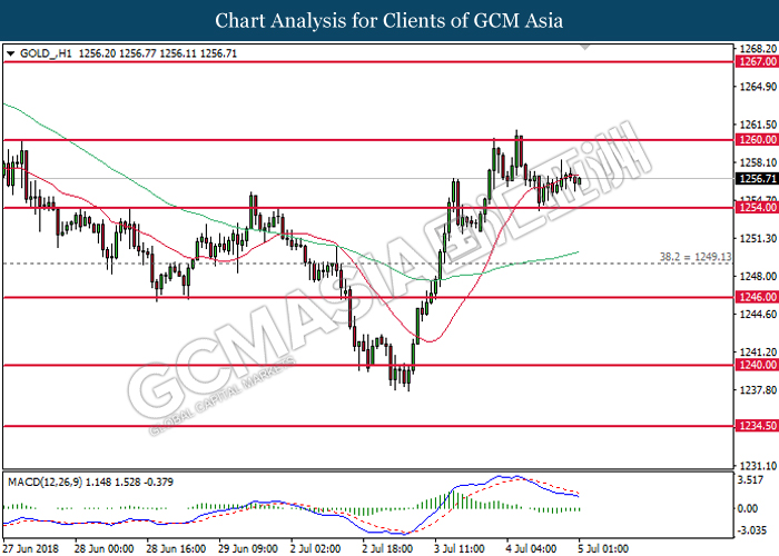 GOLD_, H1: Gold price was traded lower following prior retracement from 1257.50. MACD histogram which illustrate bearish signal suggests its prices to extend its losses in short-term, towards the direction of 1254.00.