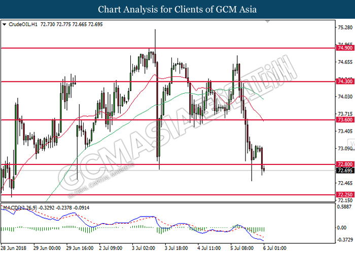 CrudeOIL, H1: Crude oil price extended losses following prior breakout at support level of 72.80. Both MA line and MACD histogram which illustrate downward signal suggest the commodity price to advance further down, towards the direction of 72.25.