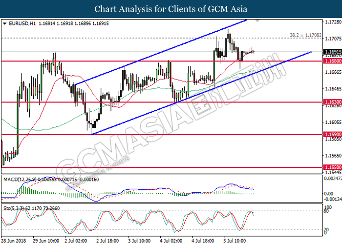 EURUSD, H1: EURUSD remains traded within an ascending channel following prior rebound from the bottom level. However, both MACD and Stochastic Oscillator which portrays bearish bias suggest the pair to extend its losses after closing below the 20-MA line (red).