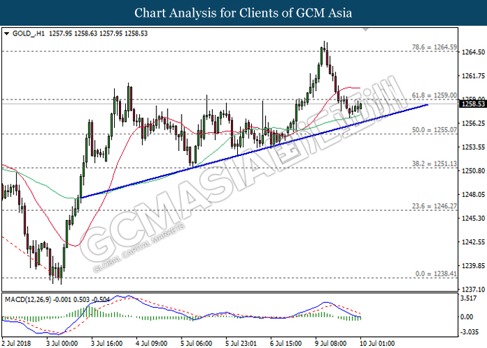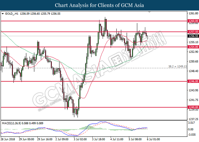 GOLD_, H1: Gold price was traded higher following prior rebound from the support level at 1254.00. However, MACD histogram which continues to illustrate bearish bias may suggest the commodity price remain in consolidation phase before extending its bullish bias.