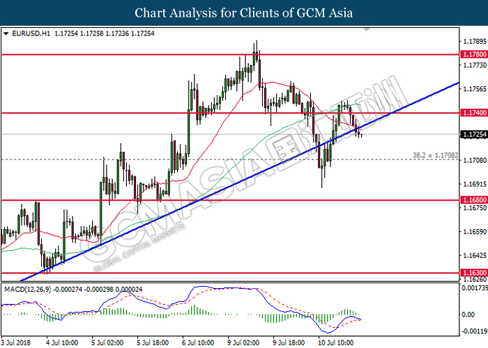 EURUSD, H1: EURUSD remains traded within an ascending triangle while recently rebounded from the lower level. Due to lack of apparent signal from MACD and price action, it is suggested to refrain from entering the market until further signal has been obtained.