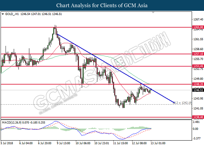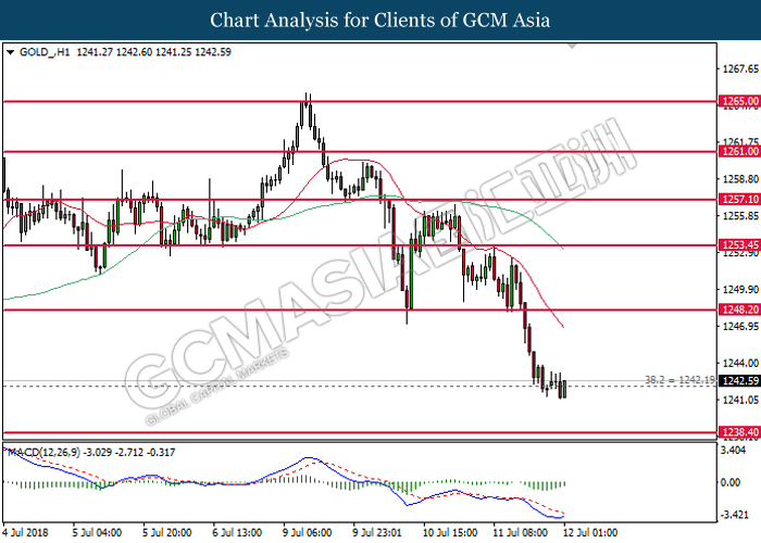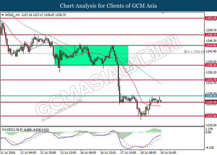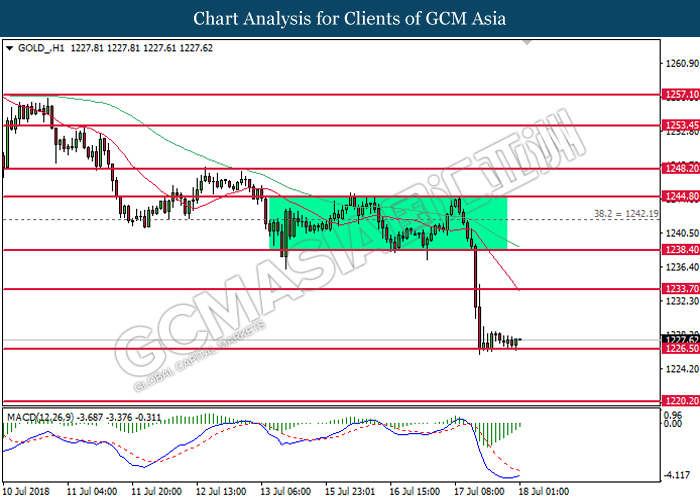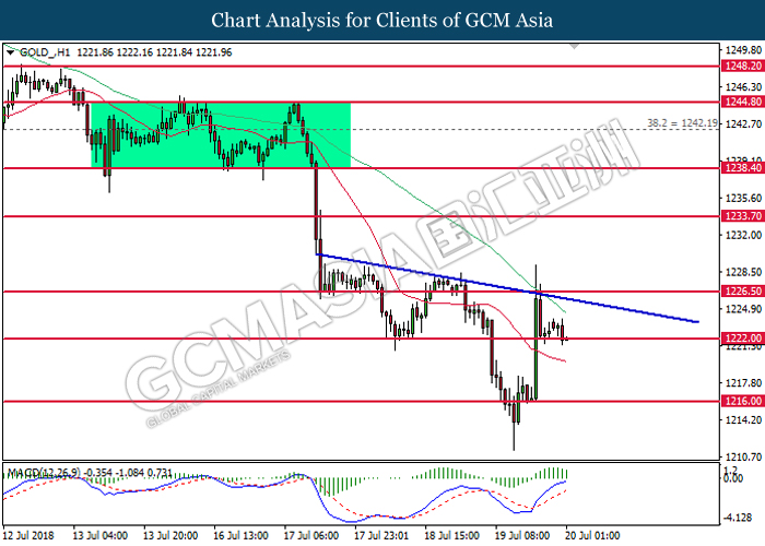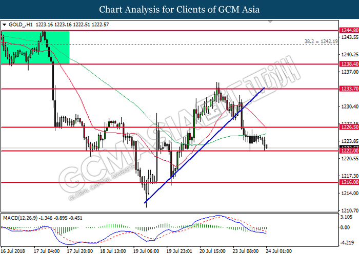 GOLD_, H1: Gold price was traded lower following prior retracement and breakout from the upward trendline. Although both MA and MACD portrays bearish signal, a close below the support level at 1222.00 is required to attain further confirmation.