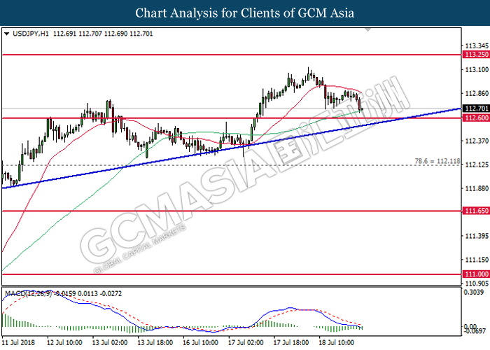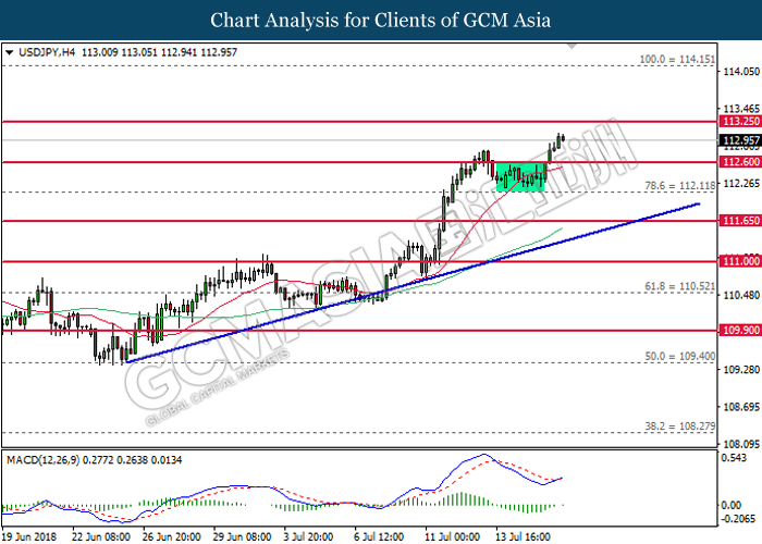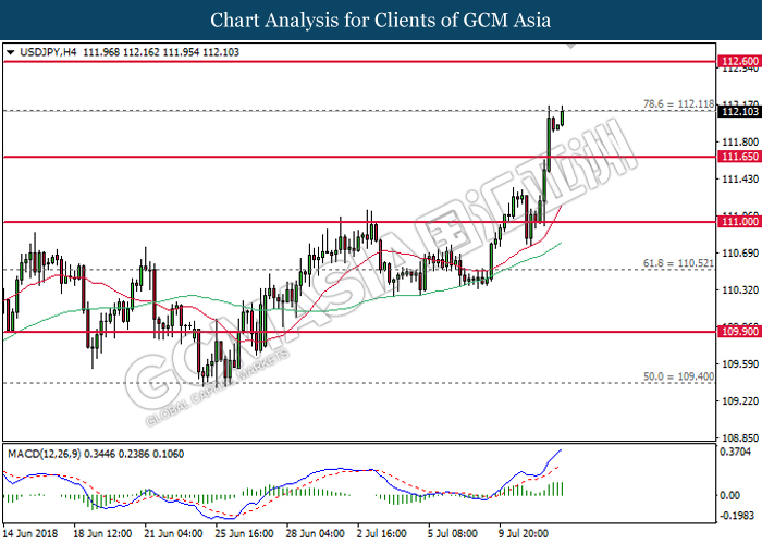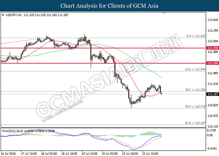 USDJPY, H4: USDJPY was traded higher following prior rebound from the support level of 110.70. However, diminishing upward momentum from MACD suggests the pair to be traded lower in short-term as technical correction.