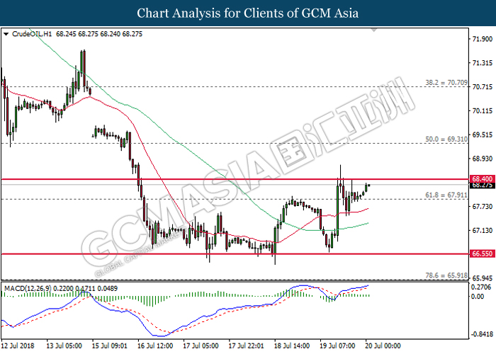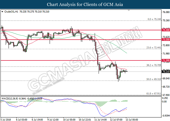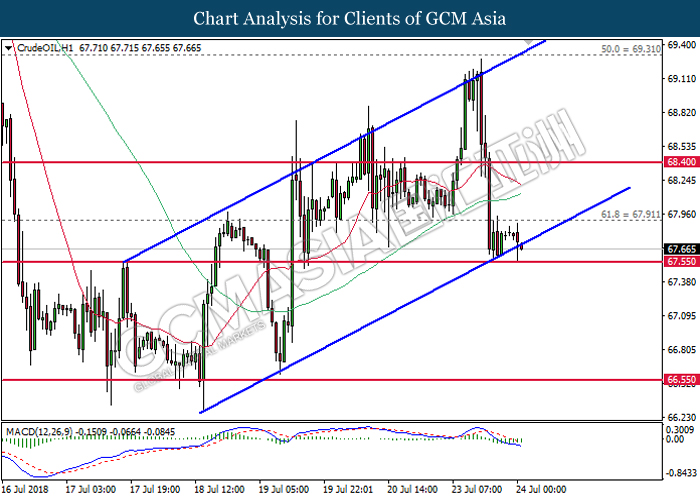 CrudeOIL, H1: Crude oil price remains traded within an ascending channel while currently testing at the bottom level. Although MACD illustrate bearish signal, a break below the channel and target at 67.55 is required to attain further confirmation.