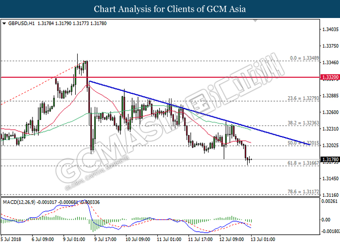 GBPUSD, H1: GBPUSD was traded lower following prior retrace from the resistance level at 1.3260. MACD histogram which illustrate persistent downward signal suggests further bearish bias. However, a close below 1.3210 is required to attain further confirmation.