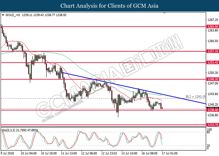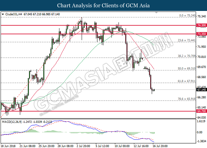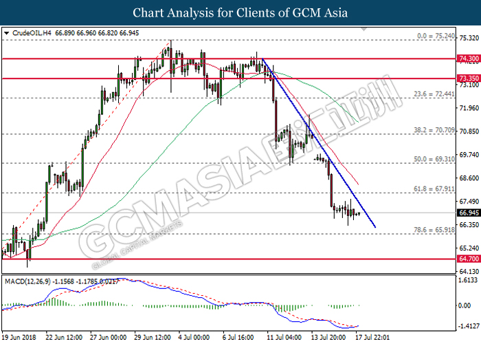 Similarly, crude oil prices were also supported by a weaker dollar following US President Donald Trump’s accusation upon EU and China over FX manipulation and recent dissatisfaction over the Federal Reserve’s rate hike plans.
