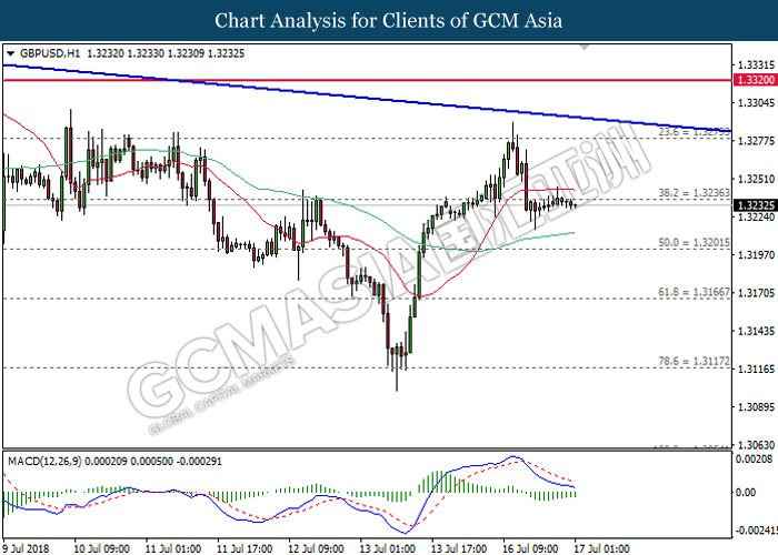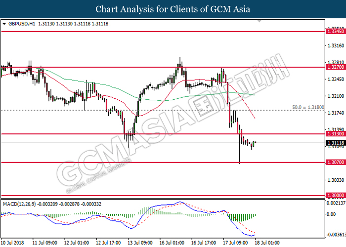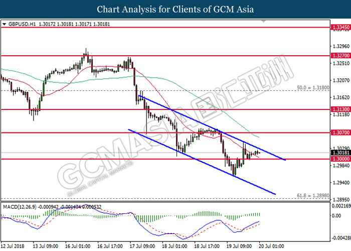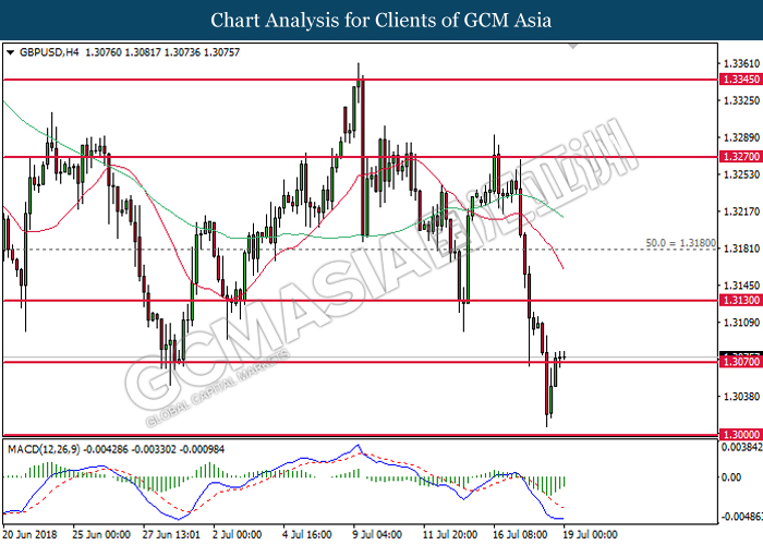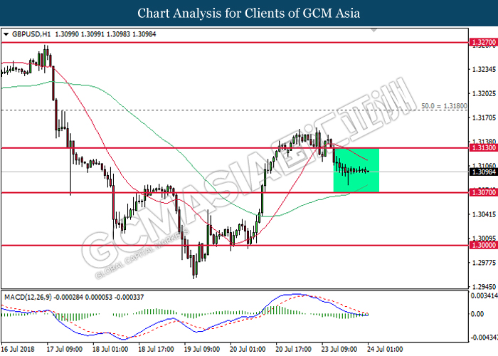 GBPUSD, H1: GBPUSD was traded lower following prior retracement and closure below the 20-MA line (red). Although MACD illustrate bearish signal, recent price action which portrays consolidation suggests to wait for a breakout at 1.3070 to further confirm the downward bias.