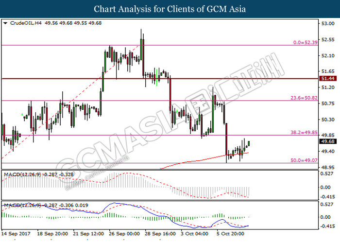 Crude OIL, H4: Crude oil price was traded higher following its rebound from support level at 49.10 and support by 200-MA line. Positive divergence as shown by MACD histogram suggests crude oil price to trade higher toward the resistance level at 49.85.