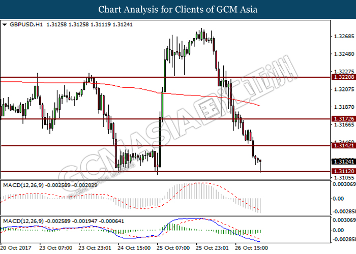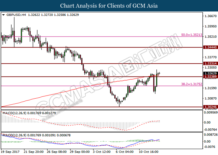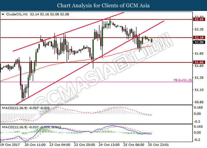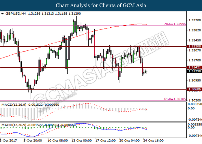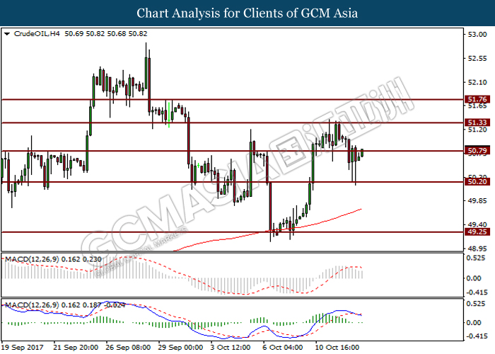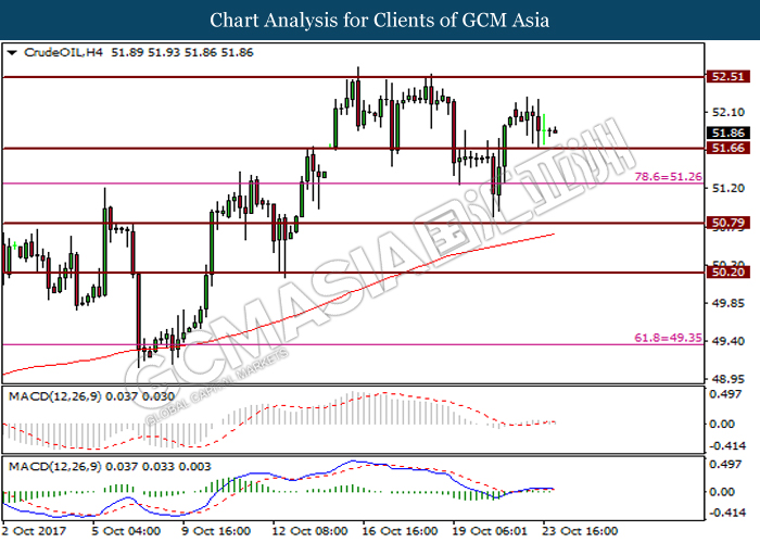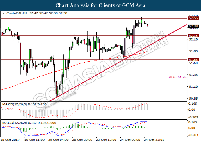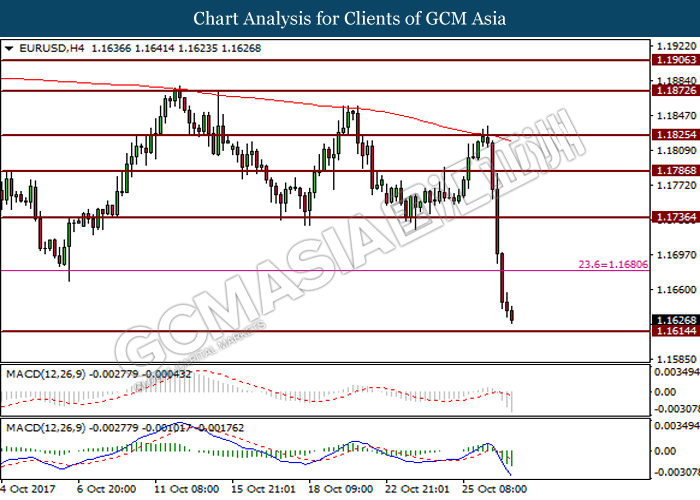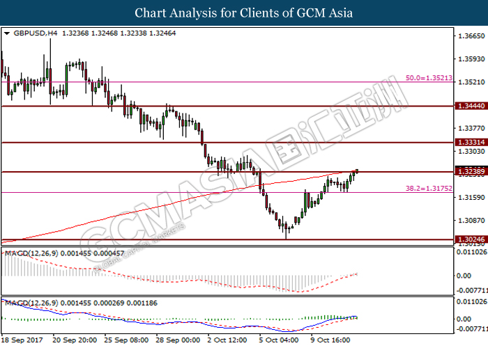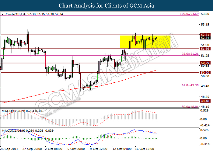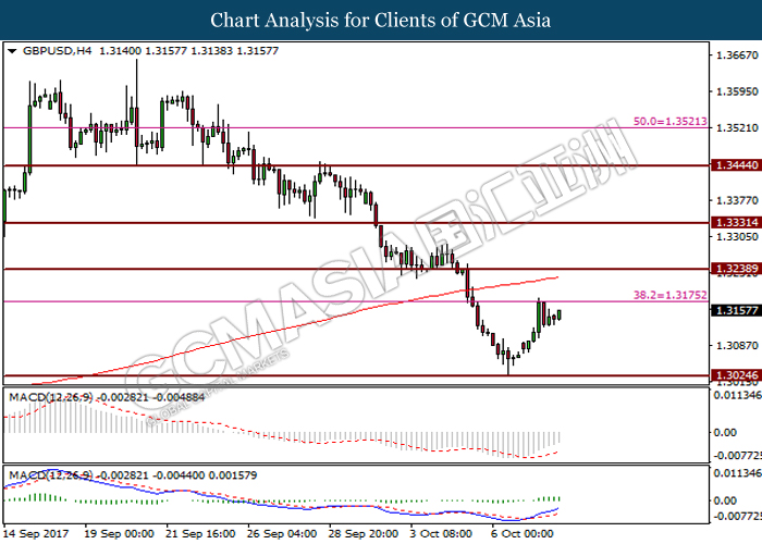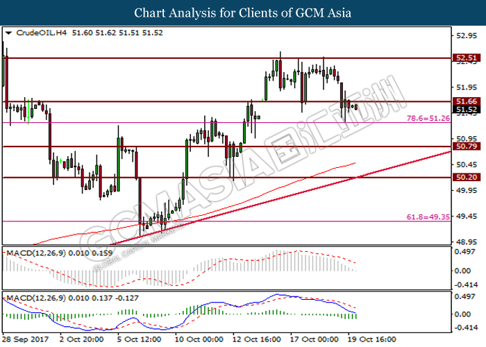 Dollar index was last quoted down 0.32% to 92.67 after Federal Reserve policymakers shown uncertainty regarding its rate hike later in December. A debate has been prolonged according to the last Fed policy meeting in September with regards to the prospects of recent sluggish inflation which could slow down the path of future rate hike. Also, an announcement is made by Fed that it would reduce its large bond portfolio starting this month following the financial crisis and unanimous vote to maintain steady interest rates. As such, Fed mentioned that they would decide future interest rate moves based on incoming inflation data over the next few months. Overnight, the latest Job Openings and Labor Turnover Survey (JOLTs) in August released by the U.S. Labor Department shown a decrease to 6.082M, below the expectations of 6.125M. On the other hand, Fed Rate Monitor Tool shown a positive market sentiment with nearly 90% of traders expect the Fed to increase interest rates in December as compared to only 80% in the previous week.