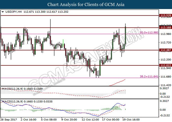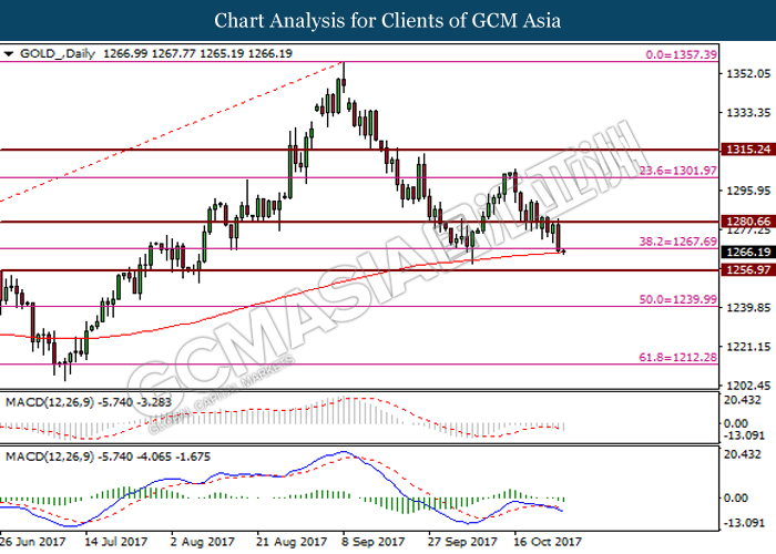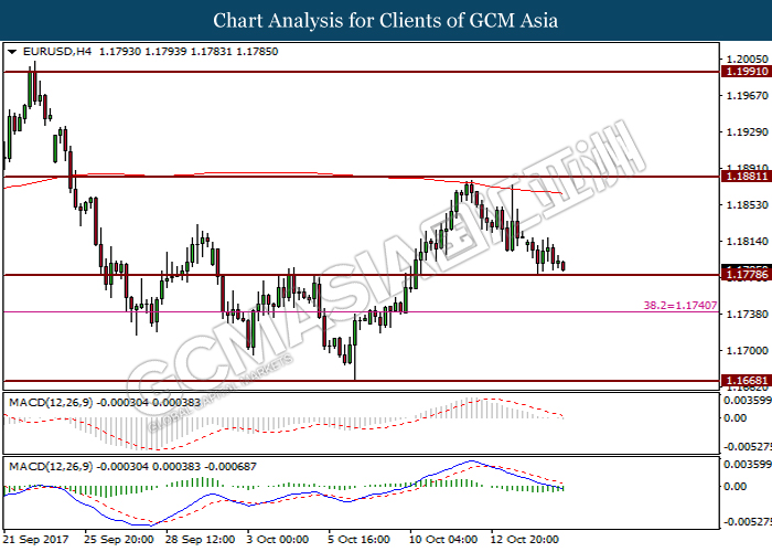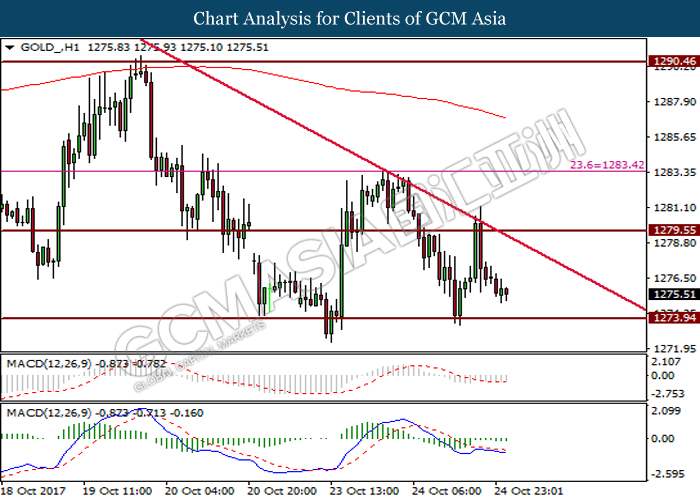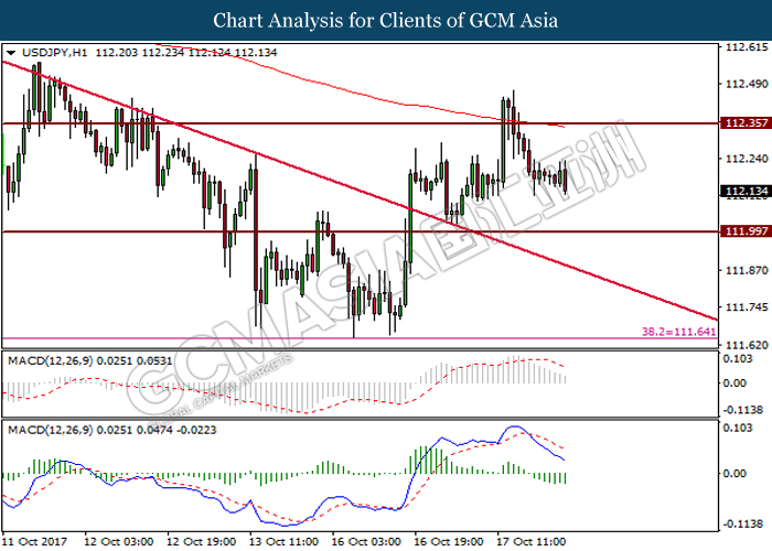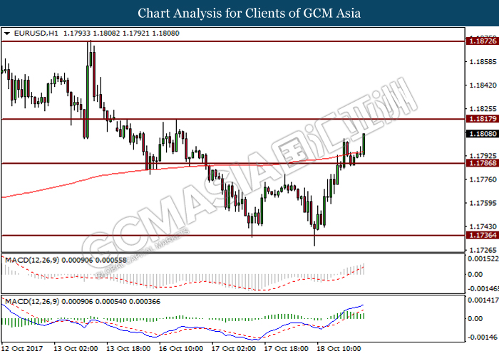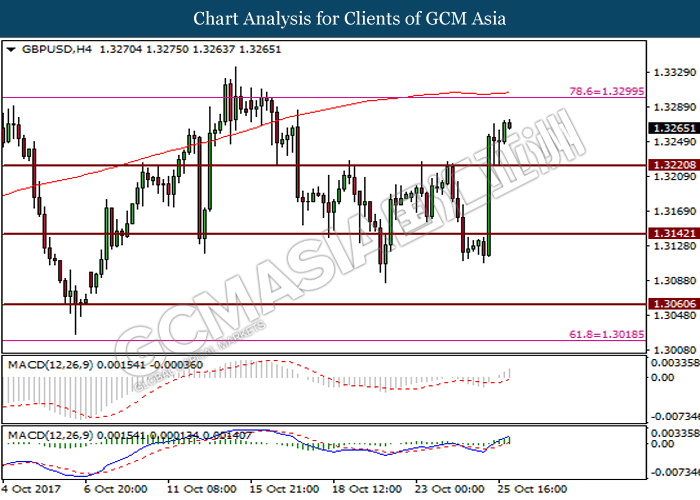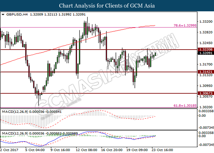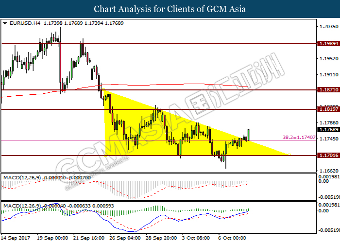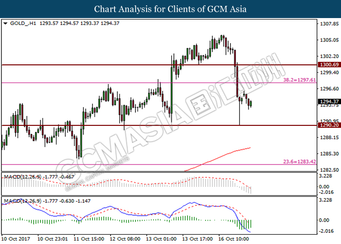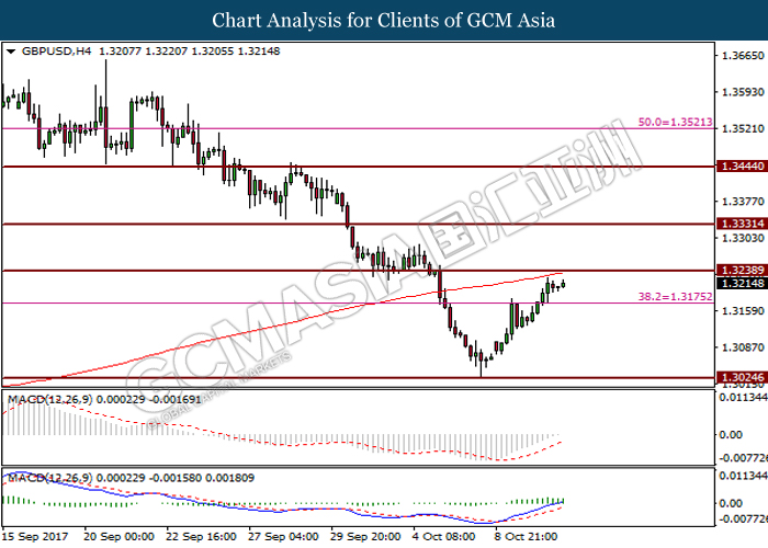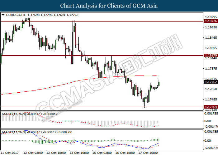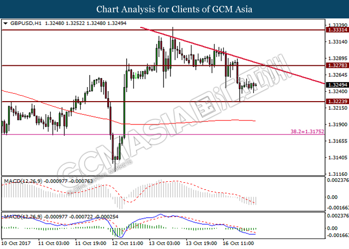 Dollar index was last quoted down 0.32% to 92.67 after Federal Reserve policymakers shown uncertainty regarding its rate hike later in December. A debate has been prolonged according to the last Fed policy meeting in September with regards to the prospects of recent sluggish inflation which could slow down the path of future rate hike. Also, an announcement is made by Fed that it would reduce its large bond portfolio starting this month following the financial crisis and unanimous vote to maintain steady interest rates. As such, Fed mentioned that they would decide future interest rate moves based on incoming inflation data over the next few months. Overnight, the latest Job Openings and Labor Turnover Survey (JOLTs) in August released by the U.S. Labor Department shown a decrease to 6.082M, below the expectations of 6.125M. On the other hand, Fed Rate Monitor Tool shown a positive market sentiment with nearly 90% of traders expect the Fed to increase interest rates in December as compared to only 80% in the previous week.