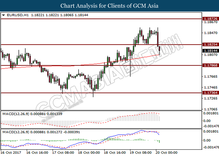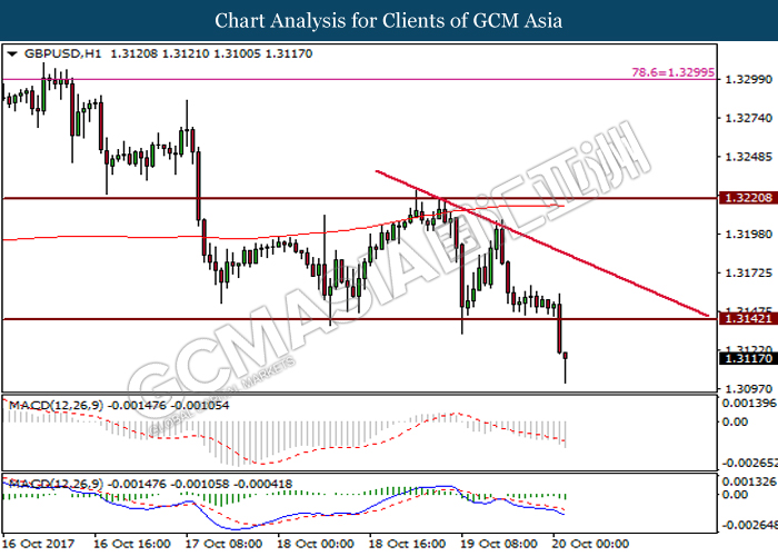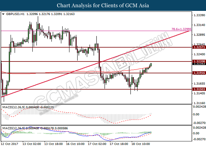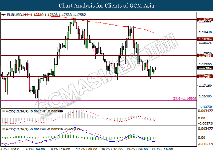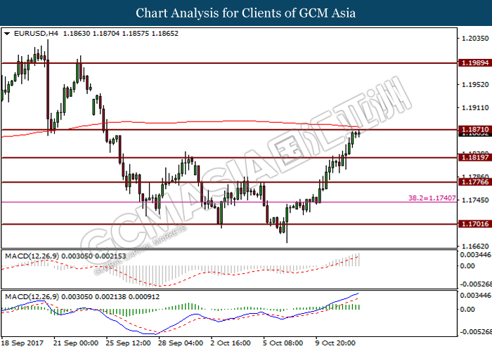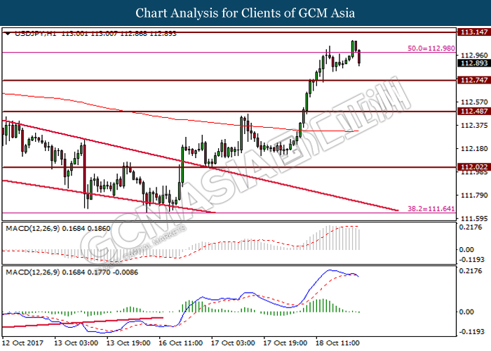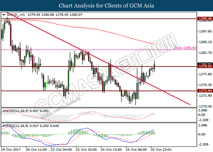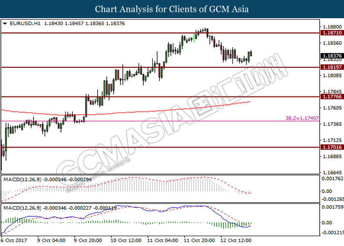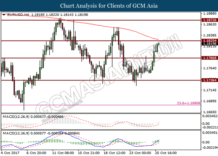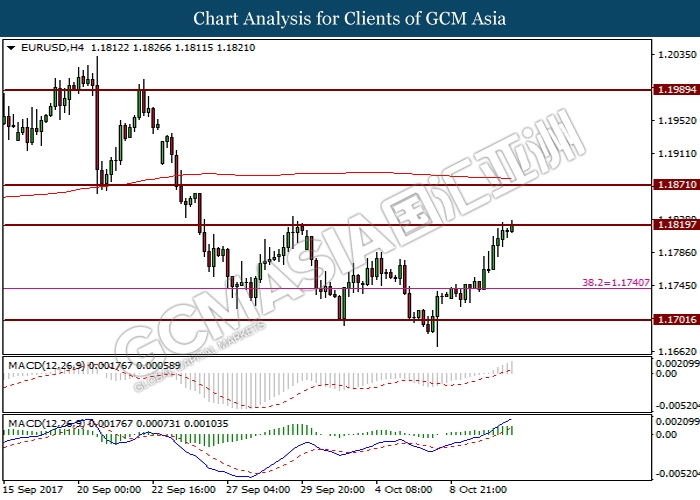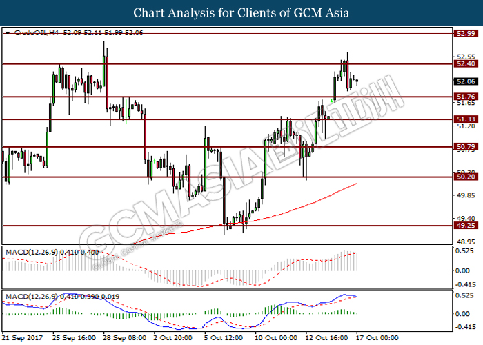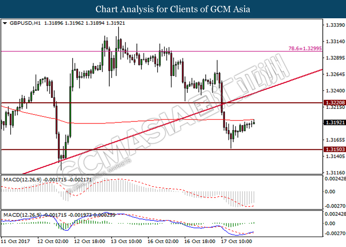 Dollar index was last quoted down 0.32% to 92.67 after Federal Reserve policymakers shown uncertainty regarding its rate hike later in December. A debate has been prolonged according to the last Fed policy meeting in September with regards to the prospects of recent sluggish inflation which could slow down the path of future rate hike. Also, an announcement is made by Fed that it would reduce its large bond portfolio starting this month following the financial crisis and unanimous vote to maintain steady interest rates. As such, Fed mentioned that they would decide future interest rate moves based on incoming inflation data over the next few months. Overnight, the latest Job Openings and Labor Turnover Survey (JOLTs) in August released by the U.S. Labor Department shown a decrease to 6.082M, below the expectations of 6.125M. On the other hand, Fed Rate Monitor Tool shown a positive market sentiment with nearly 90% of traders expect the Fed to increase interest rates in December as compared to only 80% in the previous week.