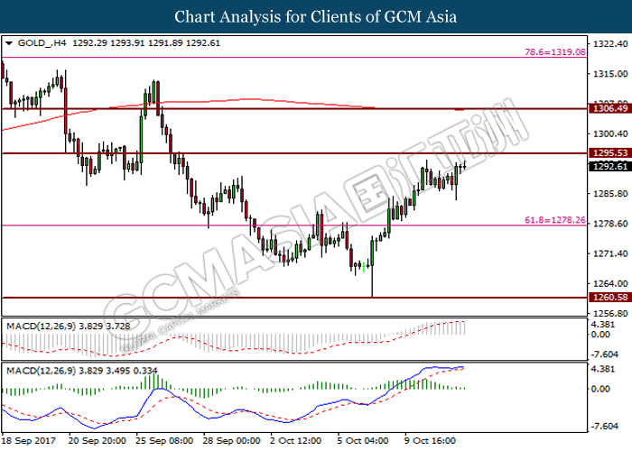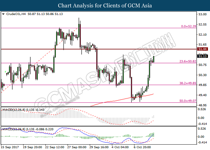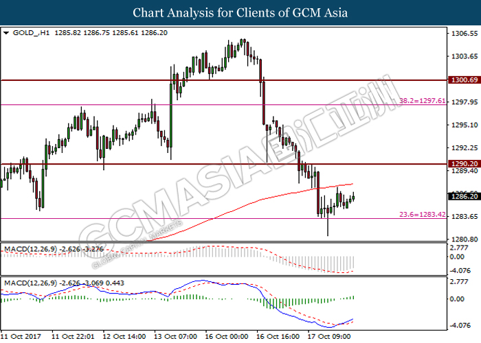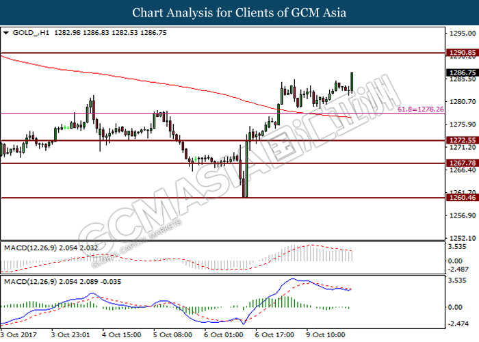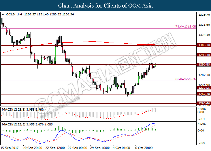 In the commodity market, crude oil price remains stable at 49.69 with an increase of 0.22% as OPEC mentioned that the market is undergoing rebalancing while U.S. production stayed offline prior to Hurricane Nate. Otherwise, gold prices continue to surge higher by 0.48% to $1287.90 as an uptick in geopolitical uncertainty increases the demand for safe-haven asset.