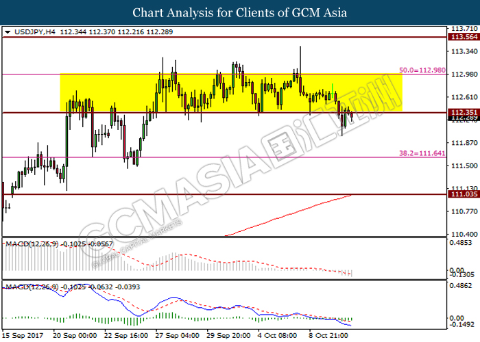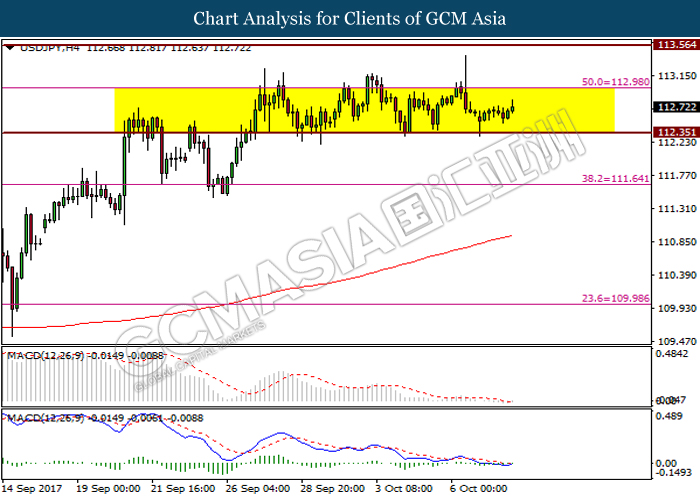 USDJPY, H4: USDJPY was traded in consolidation within resistance level at 113.00 and support level at 112.35. It is suggested to wait for breakout to occur following absent of obvious signal from both price action and MACD indicator.