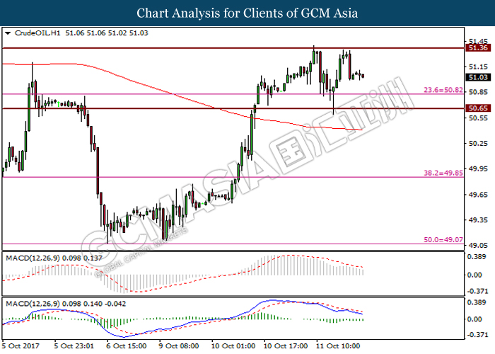 CrudeOIL, H1: Crude oil price was traded lower prior its retracement from resistance level at 51.35. Formation of engulfing candlestick pattern and negative divergence as portrayed by MACD signal line suggest crude oil price to undergo short-term technical correction to further its losses toward the support level at 50.80.