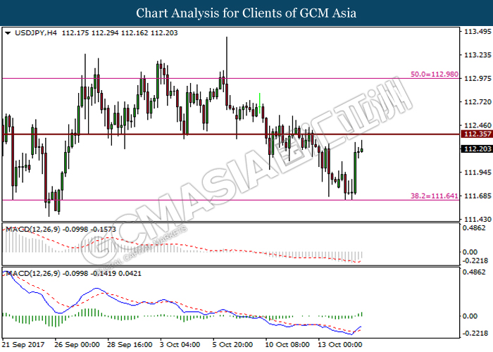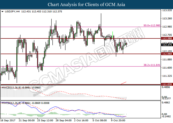USDJPY, H4: USDJPY was traded higher prior its rebound from support level at 112.05. It is suggested to stay aside and wait for clearer signal before entering the trade prior to absence of obvious signals from both candlestick pattern and MACD signal line.