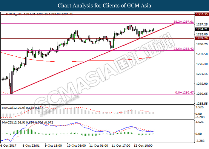 GOLD_, H1: Gold price was traded in higher prior its rebound from the bullish trend line and support level at 1289.70. Formation of bullish pinbar candlestick and golden-cross of MACD signal line suggest gold price to trade higher toward the resistance level at 1297.60.