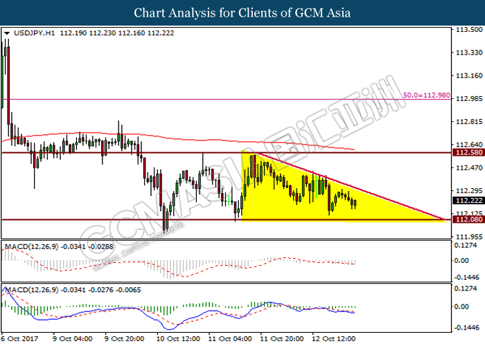 USDJPY, H1: USDJPY was traded within descending triangle. It is suggested to wait for breakout to occur following absence of obvious signal from both price action and MACD indicator.