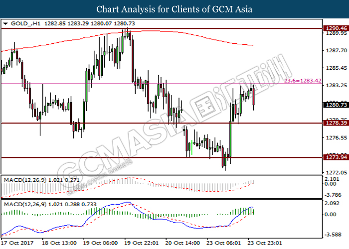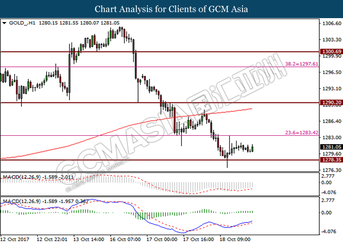 GOLD_, H1: Gold price was traded higher following its successful breaking above resistance level at 1278.25 and 200-MA line. Engulfing candlestick pattern and diminishing bearish momentum as portrayed by MACD histogram suggest gold price to trade higher toward the next resistance level at 1290.85.