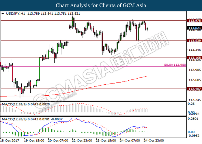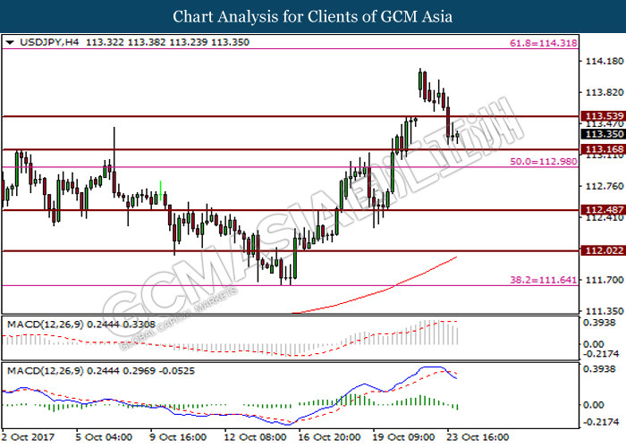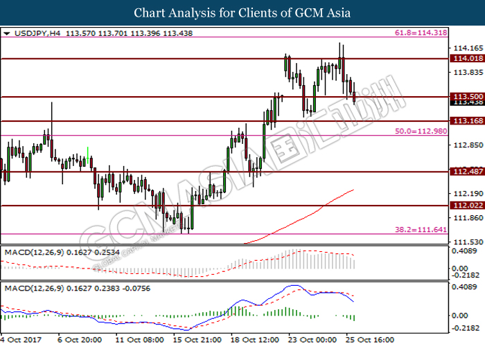 Pair of USD/JPY was down by 0.25% to 113.62, off from prior three-months high at 114.43.