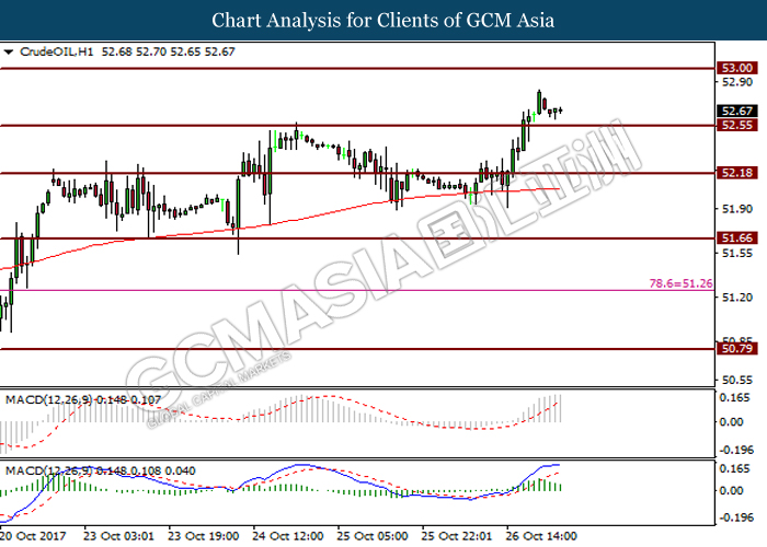 CrudeOIL, H1: Crude oil price was traded higher after breaking resistance level at 52.55. However, formation of pin bar candlesticks and downward slope of MACD histogram suggest crude oil price to undergo short-term technical correction to trade lower toward the support level at 52.55 before extending its gain.
