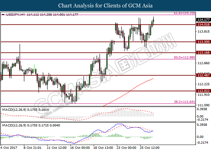 USDJPY, H4: USDJPY was trade higher prior breaking resistance level at 114.00. Golden-cross as formed by MACD signal line suggest the pair to extend its gains toward the next resistance level at 114.30.