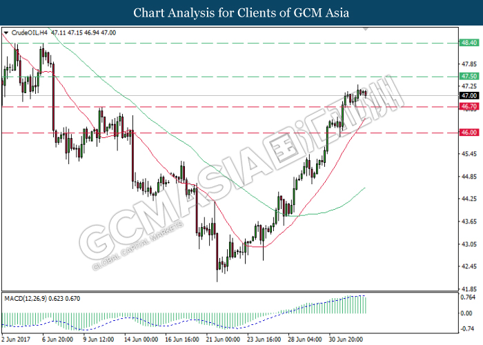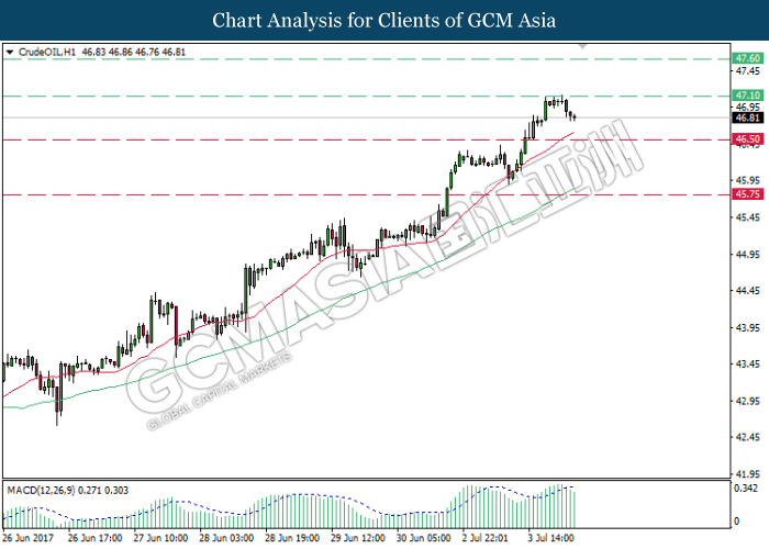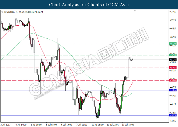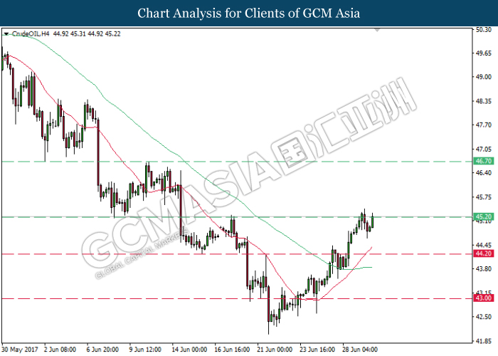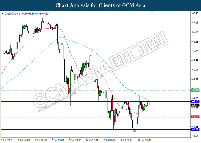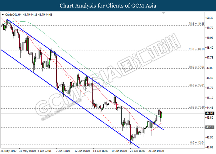 CrudeOIL, H1: Crude oil price remains traded within a range of 43.75 and 44.65 while currently testing at the top level. A successful closure above this level would signal a change in trend direction to move further upwards. Otherwise, a retrace would suggest crude oil price to extend its oscillation within the trading range.