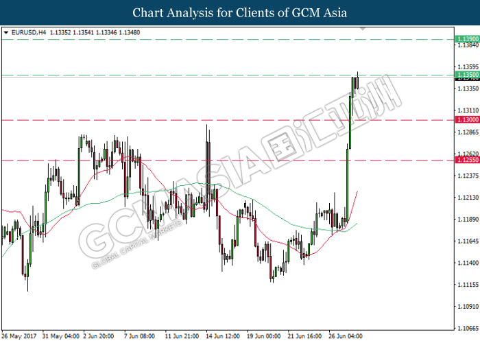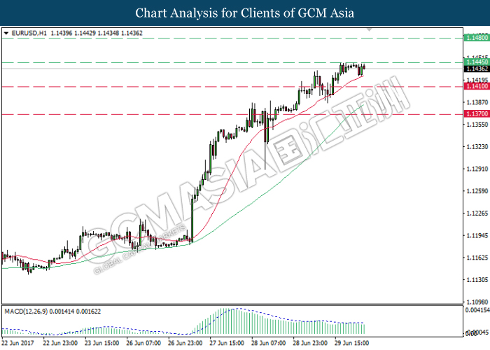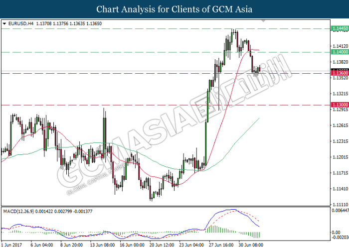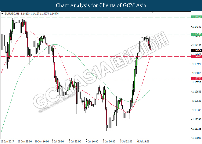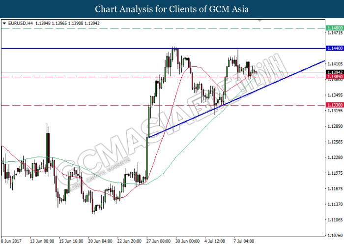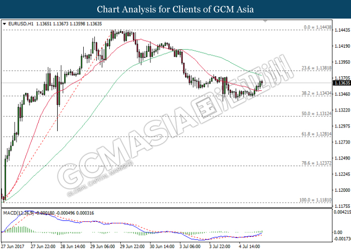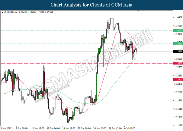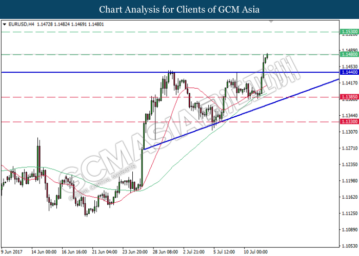 EURUSD, H4: EURUSD remained traded within a downward channel while recently rebounded from the strong support level of 1.1140. Recent closure above the 20-moving average line (red) suggests EURUSD to advance further up and retest at the resistance level of 1.1170.