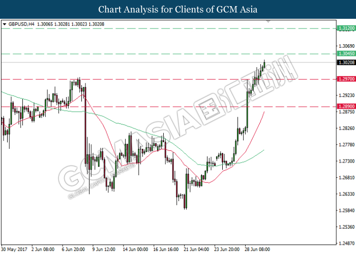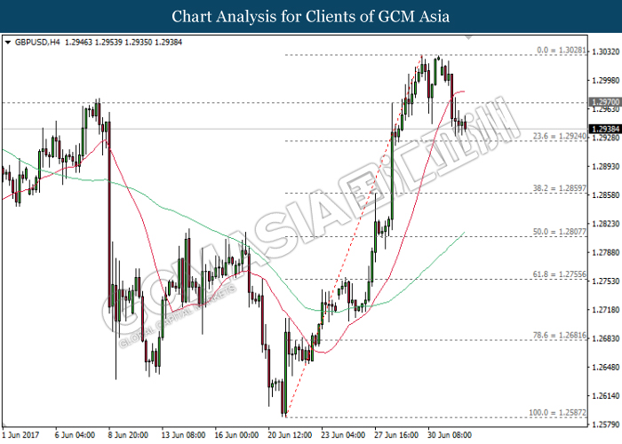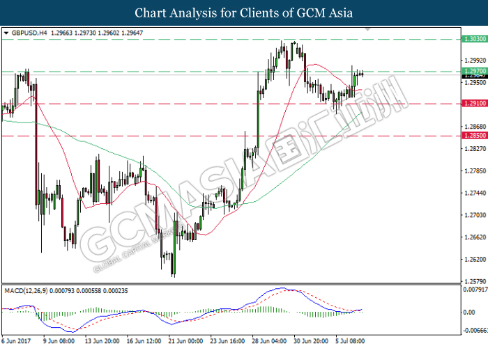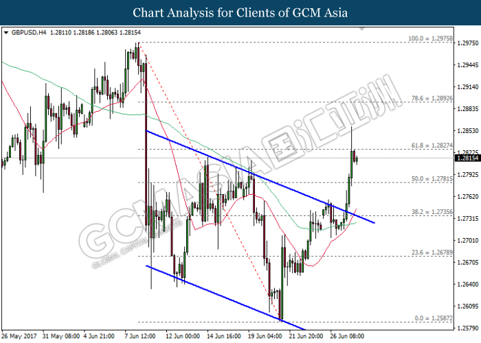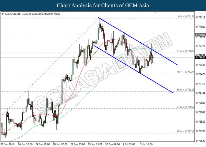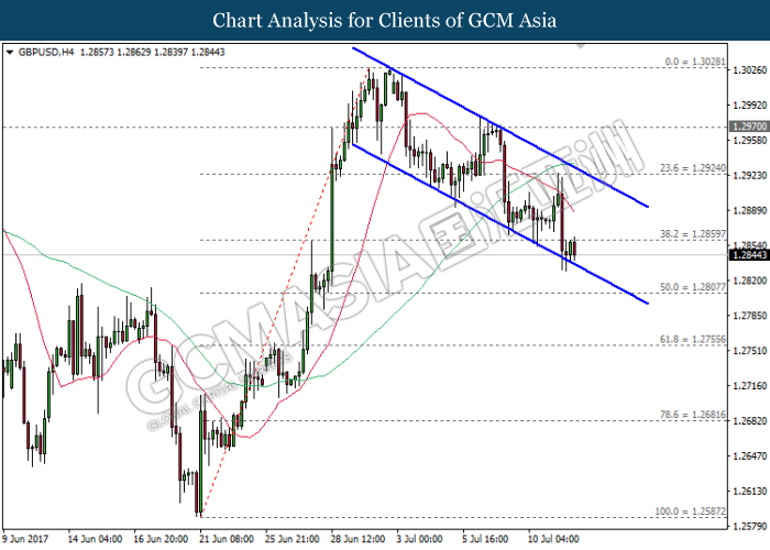 GBPUSD, H4: GBPUSD was traded within a downward channel while recently retraced from the 20-moving average line (red). It is suggested to extend its losses towards the target of support level at 1.2630 in short-term. Likewise, it is suggested to be traded within the downward channel unless a breakout occur at either side of the channel.