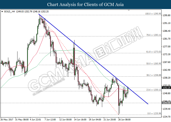 GOLD_, H1: Gold price has extended its gains following prior formation of golden cross by both moving average line. Recent closure above the 23.6 Fibonacci level of 1250.10 suggests gold price to advance further up towards the target of resistance level at 1256.00.