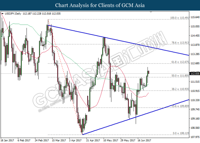 USDJPY, Daily: USDJPY remained traded within a narrowing triangle while recently closed above the strong resistance level of 111.80. Both MA lines which continues to narrow upwards suggests USDJPY to advance further up towards the resistance level of 112.70.