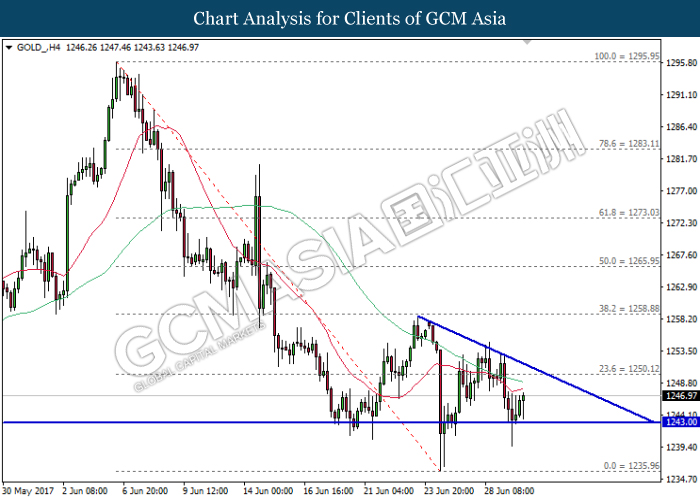 GOLD_, H4: Gold price was traded higher following prior rebound from the support level of 1243.00 while currently testing near the downtrend line. A successful breakout from this line would suggest further upward bias for gold price to move towards the target of resistance level at 1258.90.