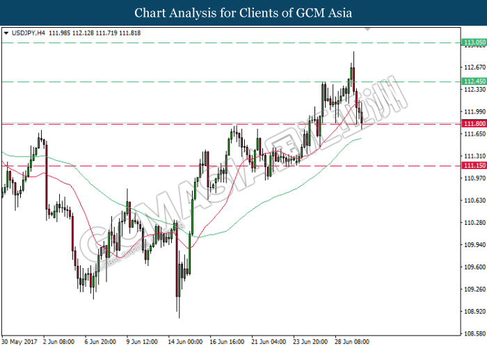 USDJPY, Daily: USDJPY remained traded within a narrowing triangle while currently testing at the resistance level of 111.80. MACD histogram illustrates increasing upward momentum while both MA lines begins to curve upwards suggests USDJPY to extend its upward momentum after breaking the resistance level of 111.80.