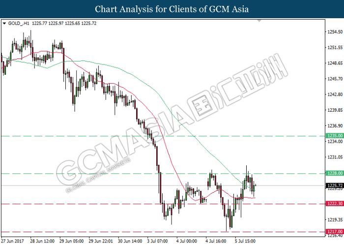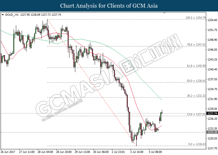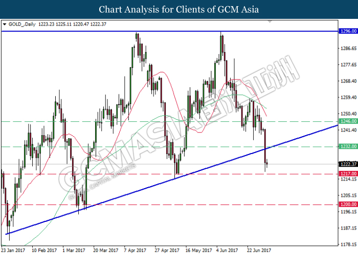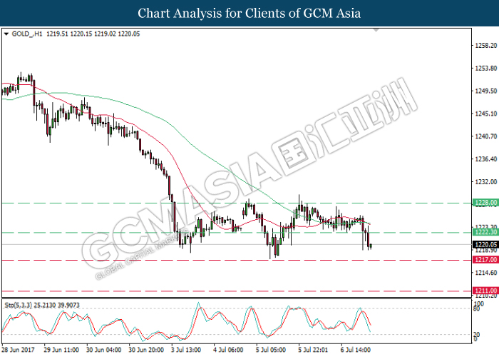 GOLD_, H4: Gold price were traded within the downward channel while recently retraced prior to the 20-moving average line (red). Stochastic Oscillator which begins to illustrate retracement signal from the overbought level suggests gold price to extend its downward momentum towards the support level of 1207.00.