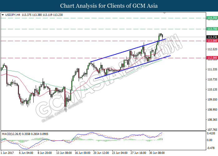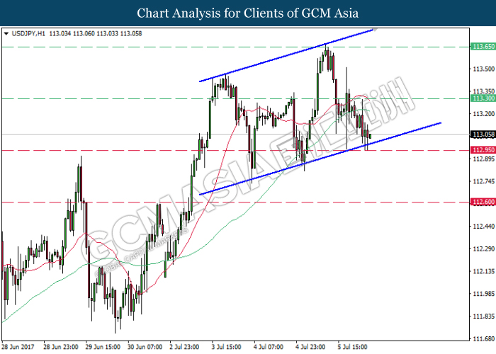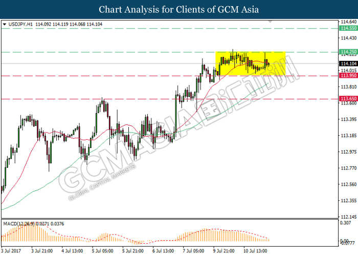 USDJPY, H1: USDJPY were traded lower following prior retracement from the strong resistance level at 114.25. MACD indicator which continues to drift outside of upward momentum suggests USDJPY to continue its oscillation in between 113.95 and 114.25 in short-term. Otherwise, long-term trend direction suggests USDJPY to extend its uptrend after closing above the level of 114.25.