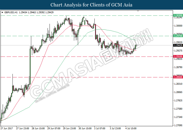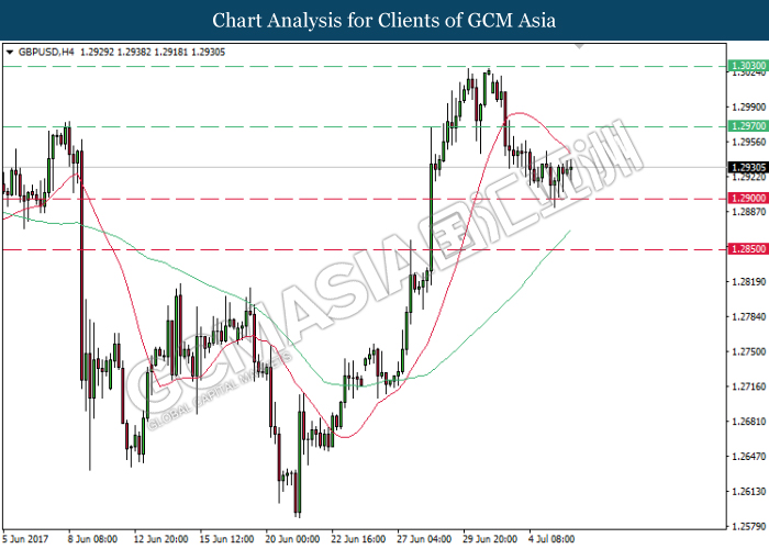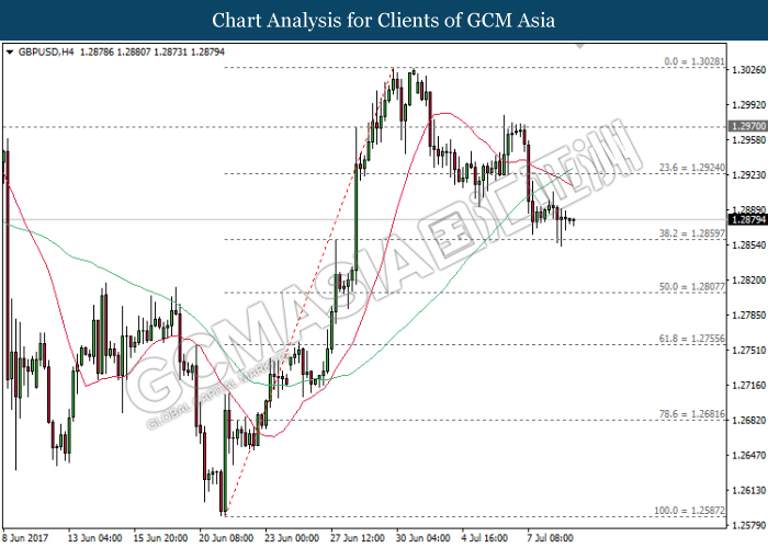 GBPUSD, H4: GBPUSD were thinly traded following prior extension of losses due to the formation of death cross by both MA lines. A successful closure below the strong support level of 1.2860 would suggest GBPUSD to extend its losses.