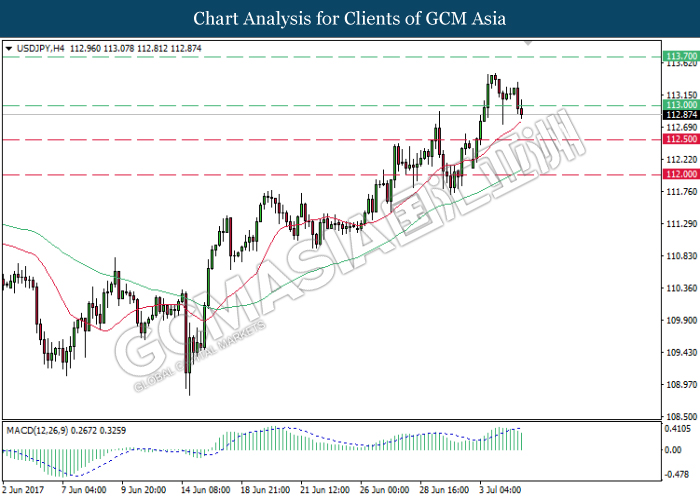 USDJPY, H4: USDJPY was traded lower following prior retracement and closure below the support level of 111.60. As the MACD indicator suggests weak upward momentum, a closure below the 20-moving average line would suggest USDJPY to extend its technical correction towards the support level of 110.90.