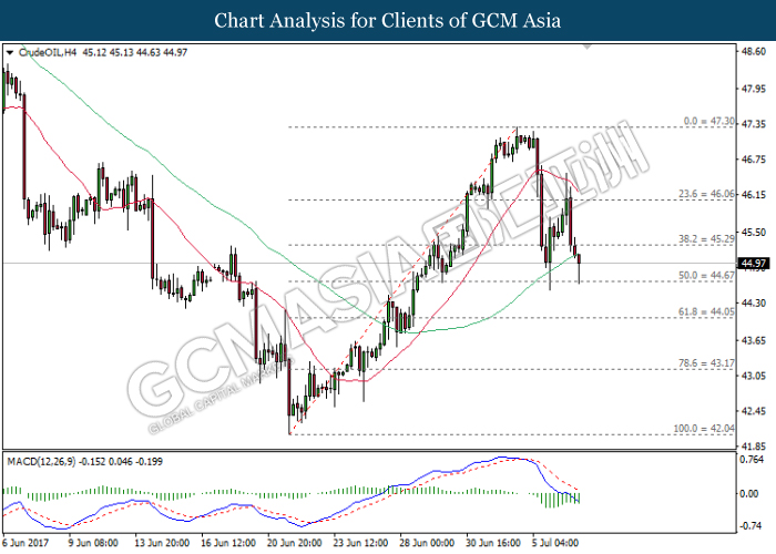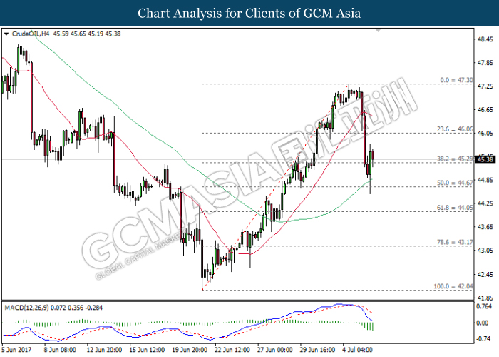 CrudeOIL, H1: Crude oil price were traded lower following prior retracement near the resistance level of 45.90. Such price movement suggest its price to be traded lower in short-term as technical correction. Likewise, long-term trend direction suggests crude oil price to extend its uptrend after closing above the level of 45.90.