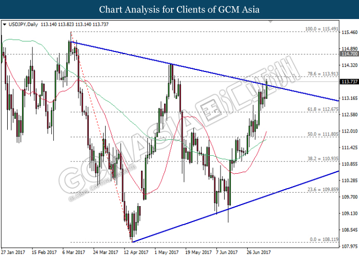 Greenback’s advance against other major peers slowed on Tuesday while majority of market participants awaits highly anticipated testimony by Fed Chair Janet Yellen due later this week. The dollar index ticked up 0.07% to 95.80 during early Asian trading hours. Analyst postulate that the next cue for the currency market will be coming from Fed’s Yellen, whereby dollar-bulls will keep an eye if she retains her hawkish view following last Friday’s robust US Nonfarm Payrolls report. Prior to this, the market has been casting doubts on the Fed’s ability to follow through with a third rate hike by year end as recent US data showed a slowdown in inflationary pressure and economic activity. On the other hand, pound sterling was held steady at around $1.2877 following overnight’s sell-off after a series of lackluster data catalyzes queries over the Bank of England’s recent summon to increase interest rate sooner. BoE Deputy Governor Ben Broadbent will be giving his speech later in the day which may provide further clarity on central bank’s policy prospects.