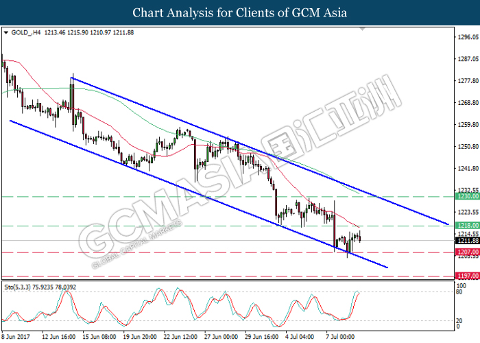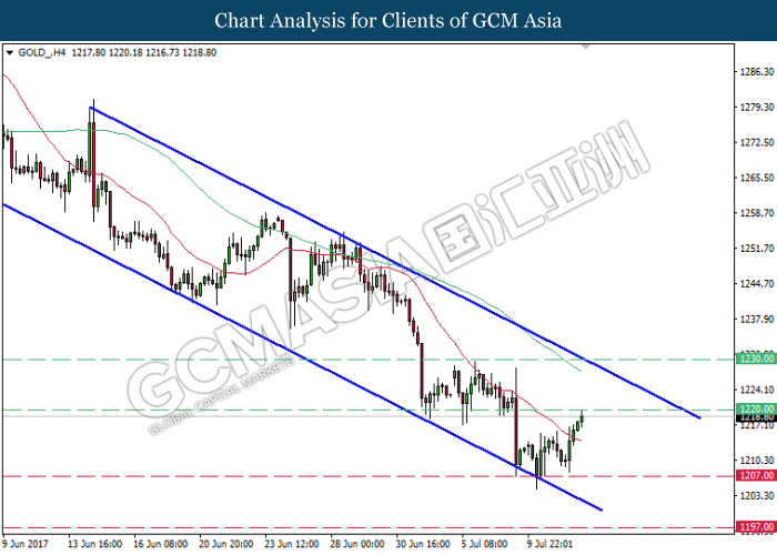 GOLD_, H4: Gold price remains traded within a downward channel after recent rebound from the support level of 1207.00. A closure above the resistance level of 1220.00 would suggest gold price to extend its upward momentum towards the upper level of the channel.