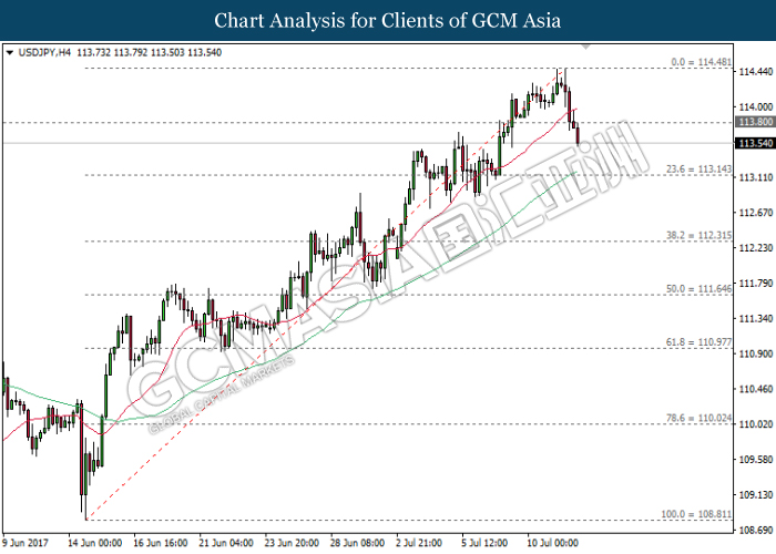 USDJPY, H4: USDJPY were traded lower following prior retracement from previous high at 114.50. Recent closure below the 20-MA line (red) suggest further downside bias for USDJPY to extend its losses towards the support level of 113.15.