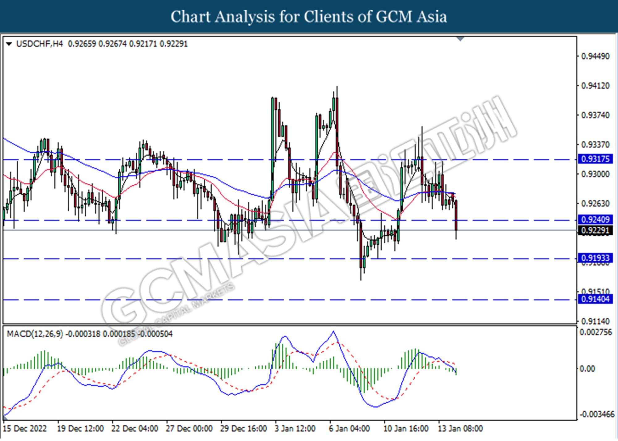 USDCHF, H4: USDCHF was traded lower following a prior retracement from a higher level. MACD which illustrated diminishing bullish momentum suggests the pair to extend its losses toward the support level at 0.9195.