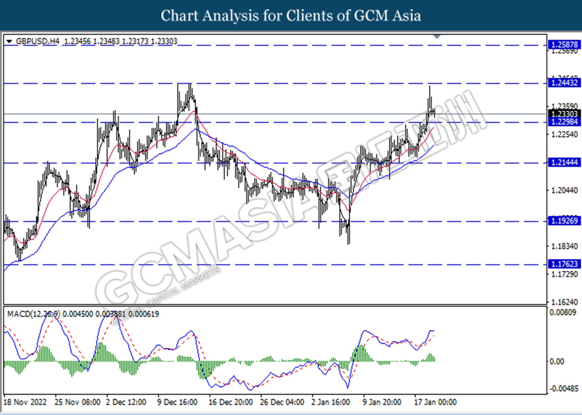 The GBP/USD, which traded widely by global investors rose significantly on Friday although the UK economy still face some challenges of recession. According to Office for National Statistics, the UK Gross Domestic Product (GDP) YoY has notched down from the previous reading of 1.5% to 0.2%, which lower than the consensus forecast of 0.3%. Besides that, the UK Manufacturing Production MoM also declined in November, whereas indicating that a contraction in the manufacturers output. However, Pound Sterling has found favour with investors over the slump of US Dollar. Last week, the US inflation rate has decreased by -0.1% in December, while it sparked the hopes of lower rate hikes by Fed in the February meeting. On the other hand, the overall trend of EUR/USD remained upward following the hawkish statement from European Central Bank member. According to Reuters, ECB policymaker Pablo Hernandez de Cos claimed on last week that the ECB would likely to continue hiking its interest rate aggressively to cool down inflation to the 2% target over the medium term. As of writing, the GBP/USD appreciated by 0.37% to 1.2274, as well as EUR/USD rallied by 0.31% to 1.0862.