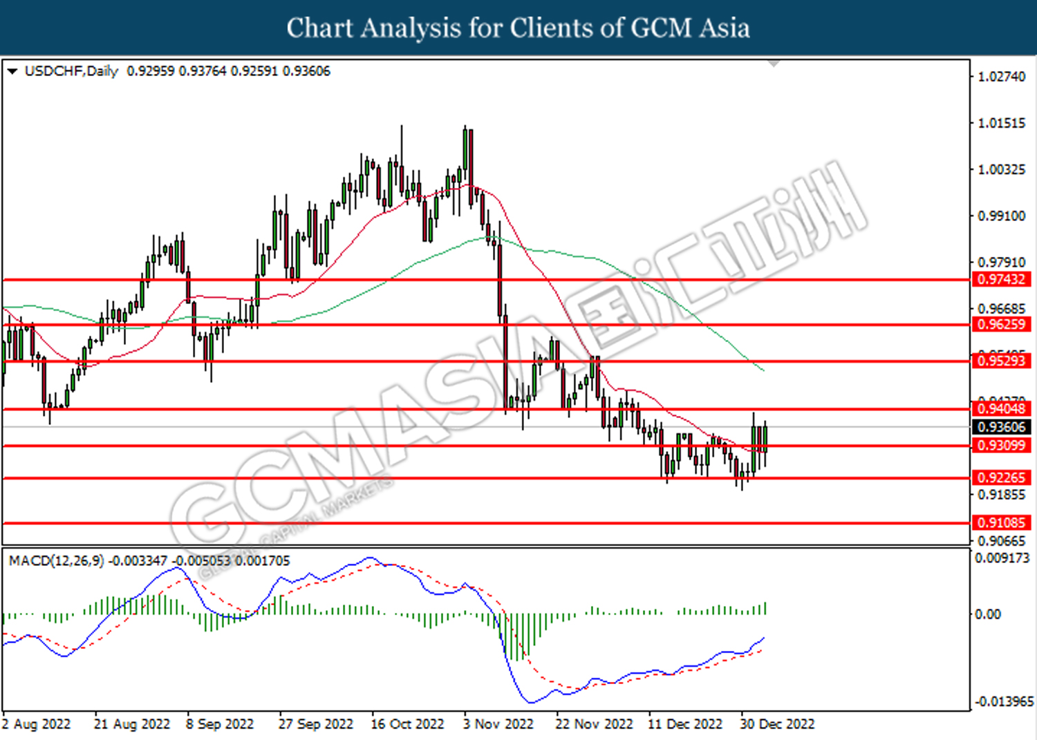 USDCHF, Daily: USDCHF was traded higher following prior breakout above the previous resistance level. MACD which illustrated increasing bullish momentum suggest the pair to extend its gains.