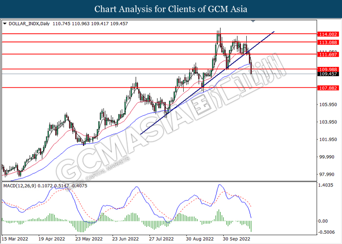 DOLLAR_INDX, Daily: Dollar index was traded lower while currently testing the support level at 110.00. MACD which illustrated bearish bias momentum suggest the index to extend its losses after it successfully breakout below the support level.