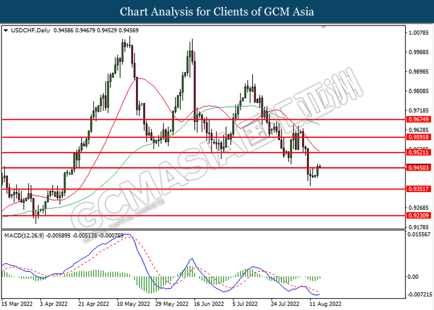 USDCHF, Daily: USDCHF was traded higher following prior breakout above the previous resistance level at 0.9450. MACD which illustrated diminishing bearish momentum suggest the pair to extend its gains toward the resistance level at 0.9520.