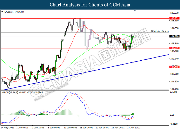 The Dollar Index was traded lower last week as market participants assessed the prospect of major central bank rate hikes to curb spiking inflation rate. The diminishing in oil and commodity prices last week had eased inflation fears while sparkling further risk appetite in the global financial market, prompting investors to shift their portfolio toward the riskier equity markets. In addition, easing inflation risk had diminished the odds for the Federal Reserve to implement tightening monetary policy in future. As for now, US Fed Fund Futures on Friday speculated a 73% probability of 75 basis point rate hike at July meeting. Though, the overall statement from the Fed’s Monetary Policy Committee (MPC) skewed to hawkish tone despite the recession risk continue to linger in the global financial market. As for now, investors would still eye on the latest monetary policy decision from Fed as well as the crucial economic data to receive further trading signal. As of writing, the Dollar Index depreciated by 0.17% to 104.00.